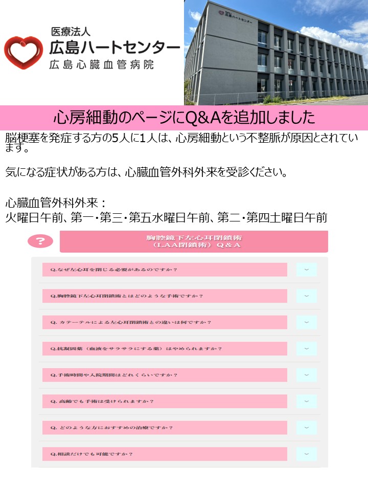 詳しくはこちらのページをご覧ください。 → 心臓血管外科のご案内 – 広島ハートセンター